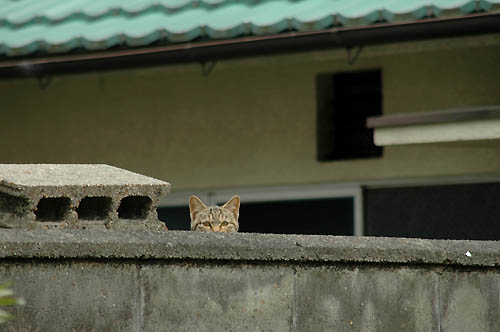 怖いもの見たさ? すぐ横に置いてある物置の屋根で私が近づく寸前まで寝ていたのに、 こっちに気が付いた途端に塀の向こうへと隠れてしまった。