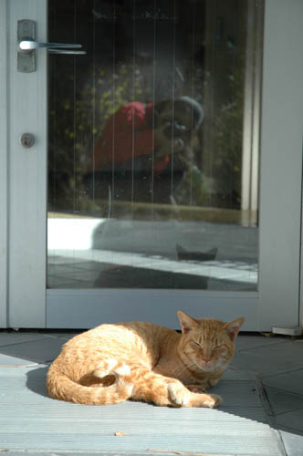 ボス茶トラ、微妙に日向と日陰でお昼寝中 後ろのドアのガラスの中に、不気味な影が・・・(笑)