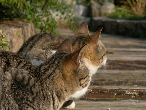 後ろから見た2匹、いかにも兄弟って感じがする。 (猫の場合いっしょに生まれたから双子って言うほうがいいのか?) 振り向き具合の角度もぴったり合っている。 こういうのを見るだけでも猫好きにはたまりませんわぁ♪