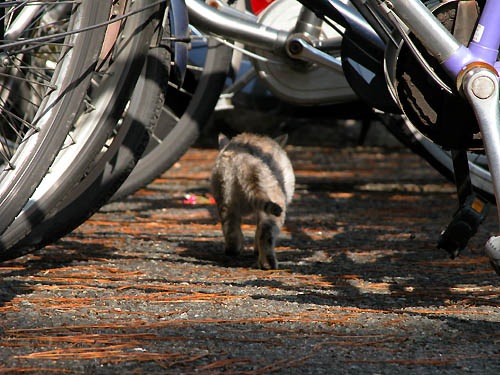 「おっちゃん、おばちゃんの自転車のトンネルや」 子猫が歩いている後姿を撮ろうと思ったら逃げられた。 ピントが合っていませんな・・・残念!