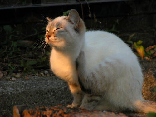 オレンジ色のお日様の光を浴びて 子猫は「カキカキ」おめかし中