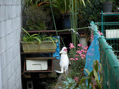 後ろにクネクネ見えるブロックはね、私のお散歩道なの スリスリする棒も沢山有るし、お花も咲いてるのよ あなたも歩きたい? でもごめんなさい、猫専用道路だから人間は駄目よ