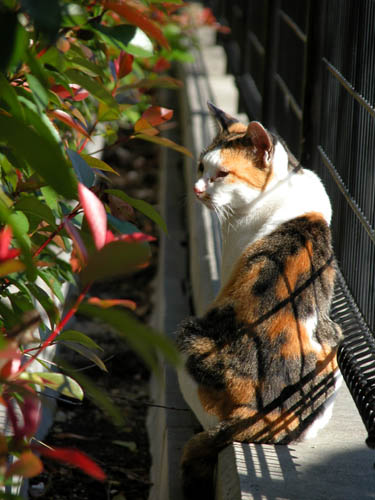 三毛さんのお気に入りの場所。 柵と植え込みの間の狭いスペース。 そこにいると落ち着きますか? 私のお気に入りの場所は そんな猫たちの居る所。