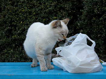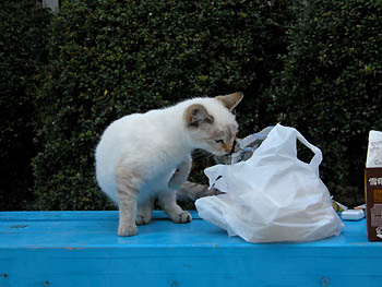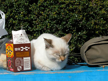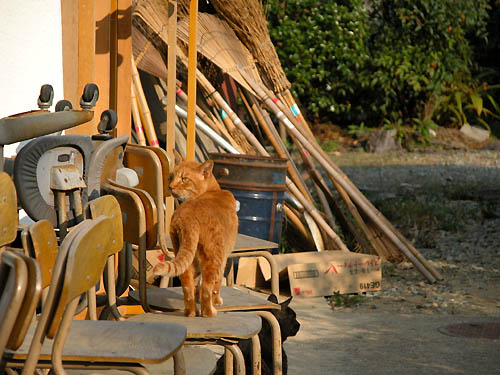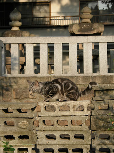 無造作に積まれたブロックがアーティスティック? カメラを固定するために肘をここについて、倒れそうになった事がある。 だって本当にただ積んであるだけなんだもん。 この猫は生まれた当時「とても可愛い猫だ」と、とても評判だった。 何人かの人が家の猫にしたいと連れて帰りたがったが、とうとう誰の手に落ちる事も無く今も沢山の猫たちと一緒に、神社の周辺で生きている。 どちらかと言うと人には馴れ馴れしくなく、野良猫としてしっかりしているのかもしれないね。